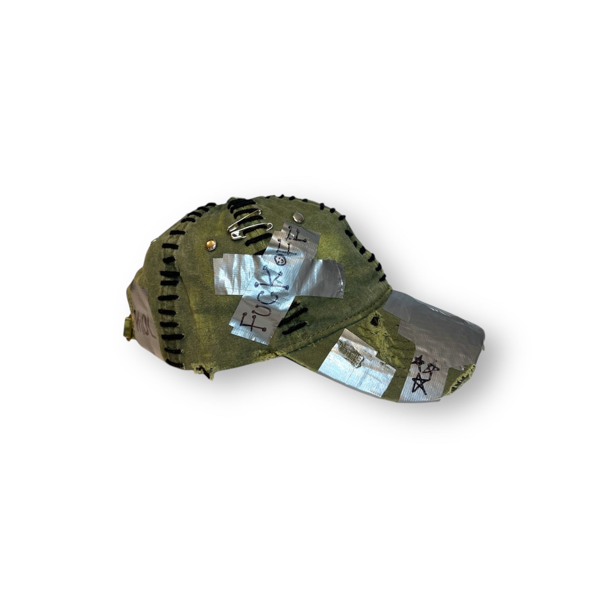 ARMY GREEN THRASHED HAT , FADED, DISTRESSED, GRAFFITI DETAIL, METAL RIVETS IN HAT EYELETS, DUCKTAPED BRIM AND SIDE PANELS, HAND SEWN